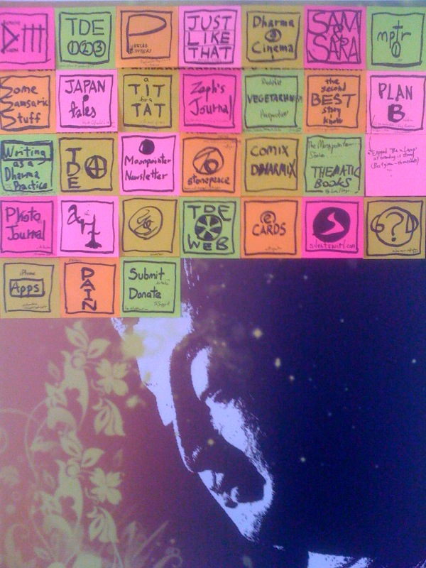 The picture above is an A1-sized picture of a Bodhisattva printed on a mounting board. It was previously used as a signboard for a Dharma event; am thus reusing it creatively here as a decorative noticeboard. Serves as a nice reminder of how the projects are linked to mindful Bodhisattva practice too. Because its surface is smoother than a wall, it’s more user-friendly if shifting post-its is going to be frequent. They can also be stuck using meaningful formats (e.g. as a mind-map), instead of the simple blocky layout above.