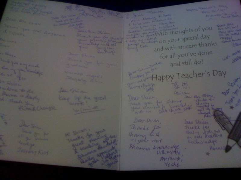A happy belated Teacher’s Day too, to our Original Teacher, Shakyamuni Buddha too, who introduced the precious Pureland teachings to us. The above is a thank you card from Dharma brothers and sisters of the Pureland Practice Fellowship (http://tinyurl.com/namoamituofo). Thank you for your encouragement. Without your support, I would not be able to share and the fellowship would not exist! May we continue to encourage one another to grow spiritually, till we reach Pureland. Amituofo!