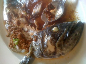 When the fish was half-jabbed by chopsticks and stripped of flesh, I snapped a photo of it with my phone. Someone remarked that I should snap it when it was whole and garnished well. I said, no, that it is better this way – as I want to capture a picture of a fish carcass in its unnatural ravaged state – to blog about it here! If I want to snap a whole fish, I would snap live fish swimming in the sea!