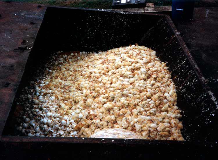 “Hundreds of thousands of baby male chicks are either ground up alive or discarded like trash to die more slowly, piled by the hundreds, even thousands, on top of one another in bins every single day in order to satiate the egg and chicken-meat industry. The majority of male chicks are basically useless to both industries, so they are considered to be “trash”. I can not tell you how hard I’ve cried watching documentary video of countless live baby chicks, freezing to death in garbage bins out in the winter cold. So, which is the more brutal scenario? Is there a more brutal scenario?”