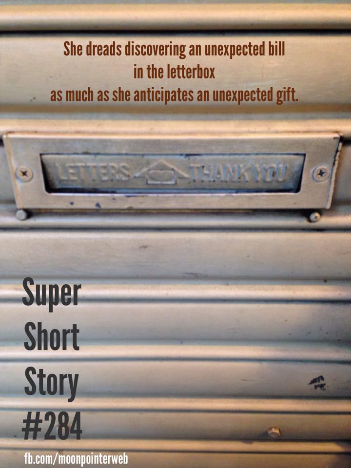 Gift: Super Short Story #284 Shen Shián December 31, 2013 Leave a Comment on Gift: Super Short Story #284 Posted in Stories Super Short Story #284: Gift She dreads discovering an unexpected bill in the letterbox as much as she anticipates an unexpected gift.