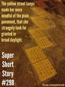 Pavement: Super Short Story #298 Shen Shián December 31, 2013 Leave a Comment on Pavement: Super Short Story #298 Posted in Stories Super Short Story #298: Pavement The yellow street lamps made her more mindful of the plain pavement, that she strangely took for granted in broad daylight.