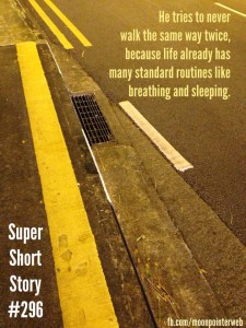 Walk: Super Short Story #296 Shen Shián December 31, 2013 Leave a Comment on Walk: Super Short Story #296 Posted in Stories Super Short Story #296: Walk He tries to never walk the same way twice, because life already has many standard routines like breathing and sleeping.
