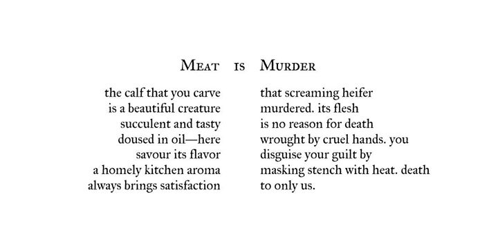 Meat Is Murder moonpointer June 20, 2016 Leave a Comment on Meat Is Murder Posted in Veganism A poem that can be read two ways via two columns and all the way across! (From Jerome Lim)
