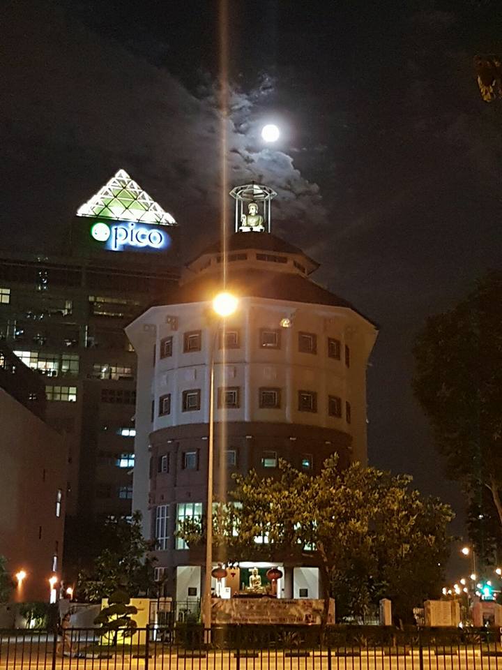 A rather super moon (on 15 November 2016), after the Understanding Amituofo class, above the Buddha, as snapped by class participant Bro EK. The full moon is a favourite metaphor for the brightness of our Buddha-nature! Amituofo