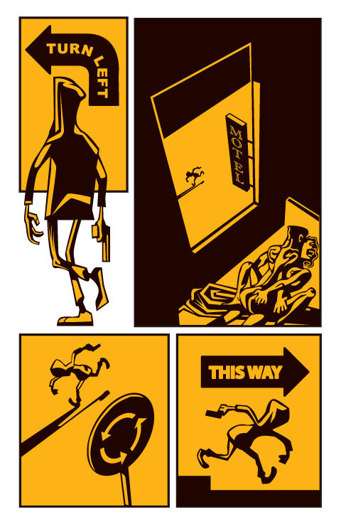 In ‘Signs’ by Miel in ‘Liquid City 2’, a guy sees many street and shop signs – Beer, sex shop, bar, deli… But he pays attention to ‘Just Do It’ – but do what? He shoots to kill, and follows a series of signs – turn left, roundabout, this way, enters ‘no entry’ though. He runs from the ‘Repent’ sign at a church. The police come – labelled with ‘signs’ of sounds and lights. He finally corners himself and dies in shootout at a ‘Dead End’ sign.