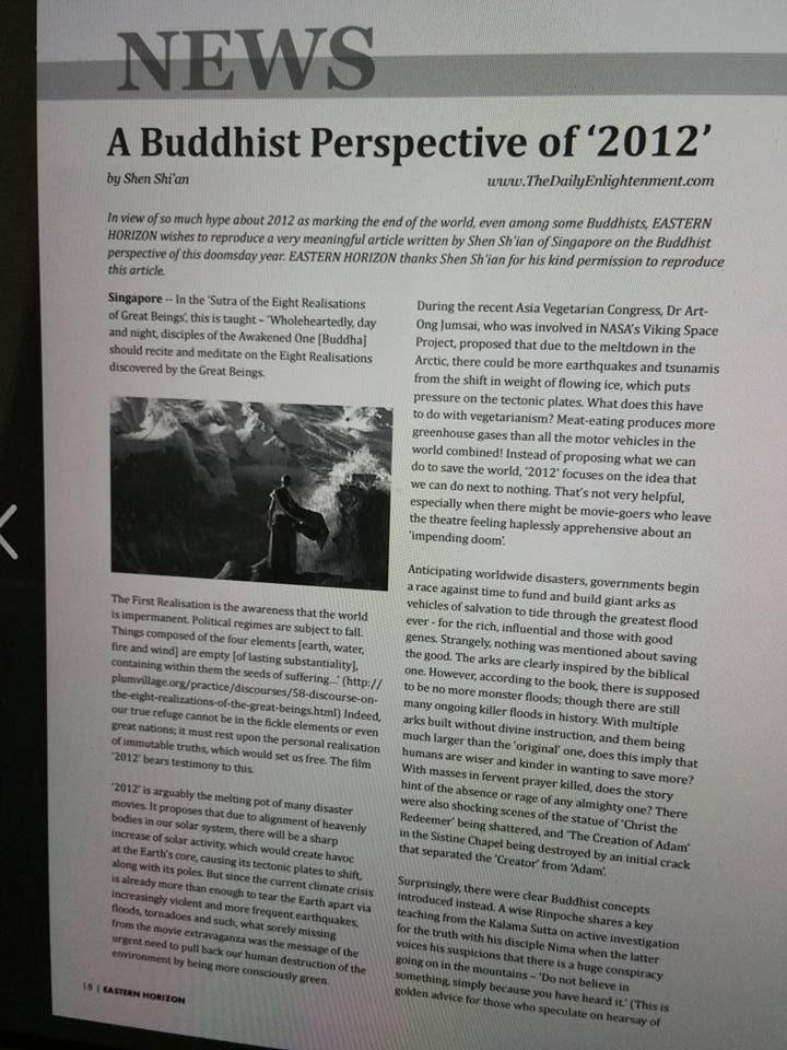 Written some years ago in anticipation of the end-of-2012-is-end-of-world hoo-ha to ease the panic while offering a reality check. Read about it at http://thedailyenlightenment.com/2009/11/a-buddhist-perspective-of-2012 to prevent similar confusion in the future!