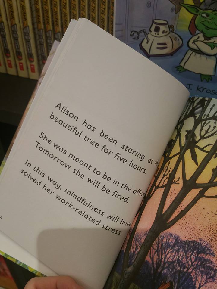 Unmindful Escapism Shen Shián January 24, 2017 Leave a Comment on Unmindful Escapism Posted in Books Another funny page from the book mentioned in the previous post. This one is on how indulgence in so-called ‘mindfulness’ of the moment can lead to mindless suffering in future!