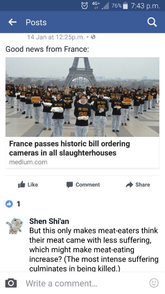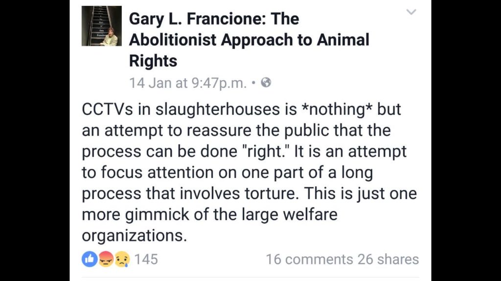 For showing both sides of the coin, cameras should be at the entire process of the breeding as well as the kill floor. Cameras at the kill floor only ironically might increase demand for meat due to reasons above. It can lead to the attitude of ‘Phew! I’m eating “less cruel” meat in France (though killing is always cruel). Thank goodness! I can now eat more meat “more morally”. (Never mind that this demands more breeding and killing.)’ That’s the problem, making welfarism in this instance a step backwards, not forward at all. It’s an illusion of moral progress. Real progress for real ‘welfare’ must contribute to real advancement towards veganism; instead of ‘preventing’ it, by making it seem less pressing.