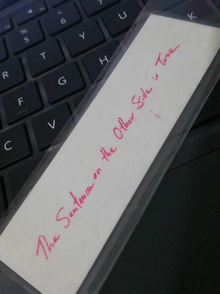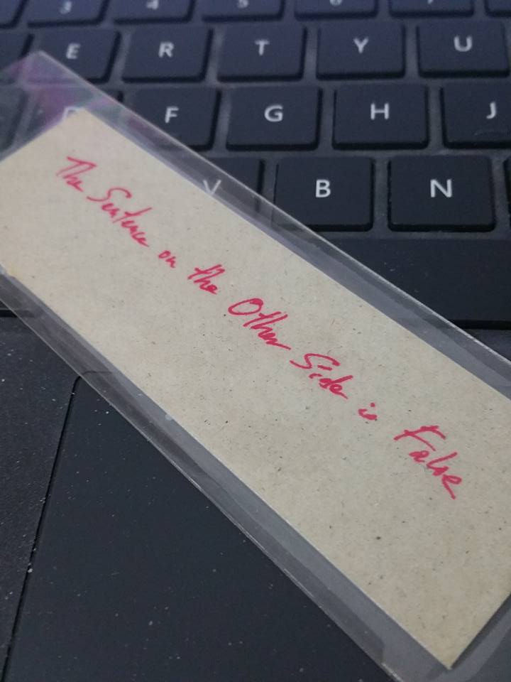 Made this ‘bookmark’ demonstrating the Liar’s Paradox some time back. One side says, ‘The sentence on the OTHER side is FALSE’, while the other side says, ‘The sentence on the OTHER side is TRUE.’ What should we make of this?