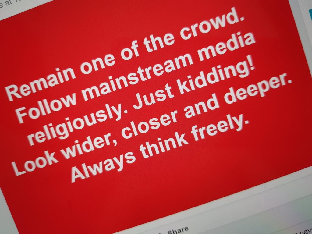 Think Free Shen Shián June 27, 2017 Leave a Comment on Think Free Posted in Mix Remain one of the crowd. Follow mainstream media religiously. Just kidding!Look wider, closer and deeper. Always think freely.