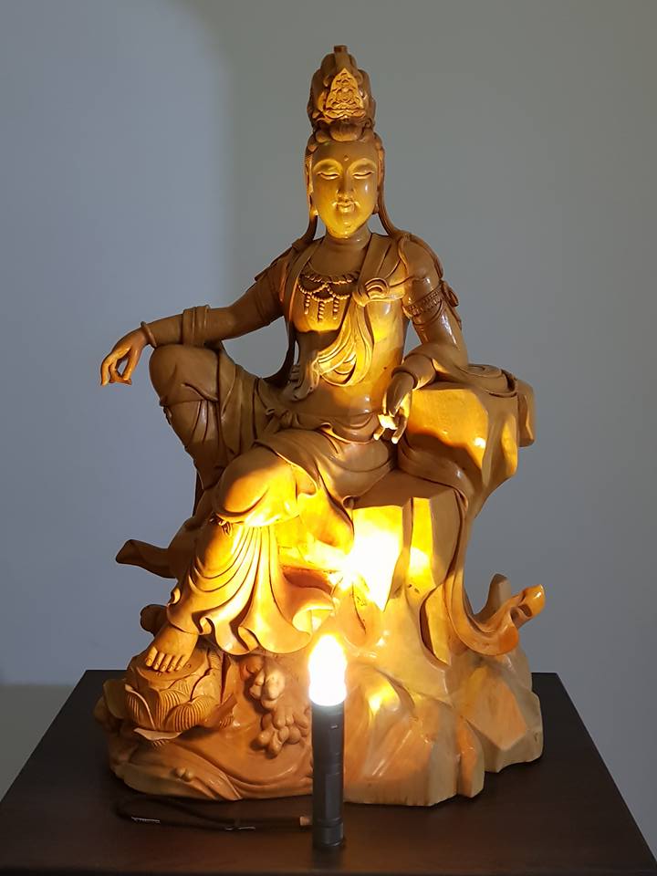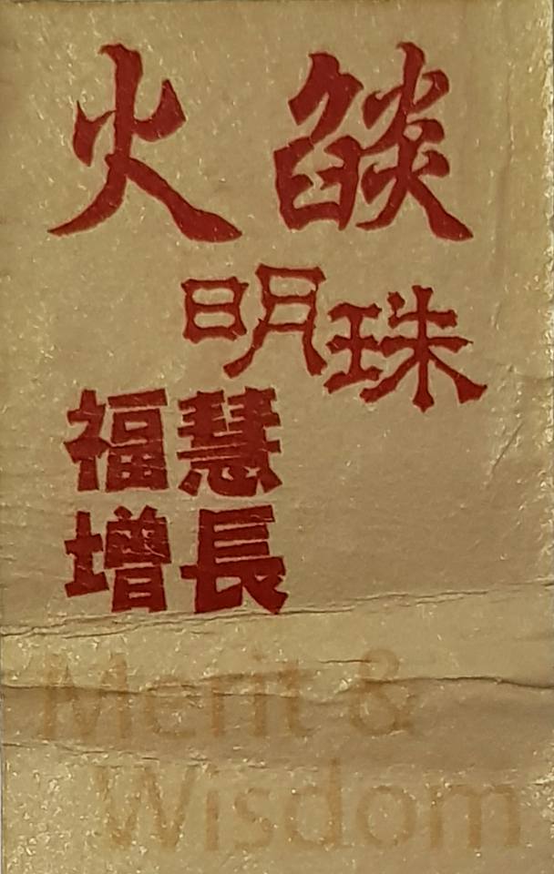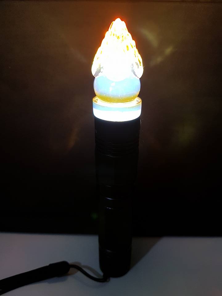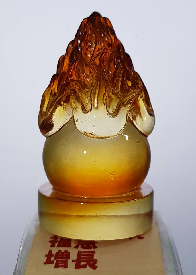 A small decorative souvenir (火焰明珠: flaming gem of Ksitigarbha Bodhisattva; 地藏菩萨) from years ago, that can be used as a brilliant and colourful light offering by placing on a torch! The first picture is its close-up on the torch, while the third picture shows its natural colours. It was not designed to be used this way, but hey, let’s bring out the splendour!