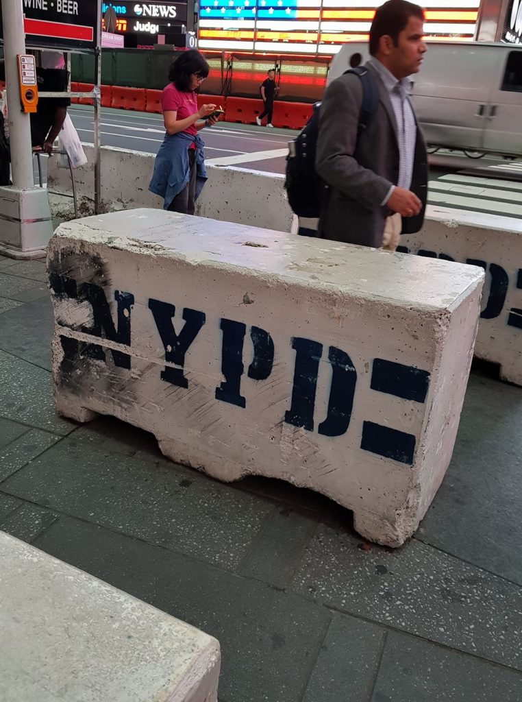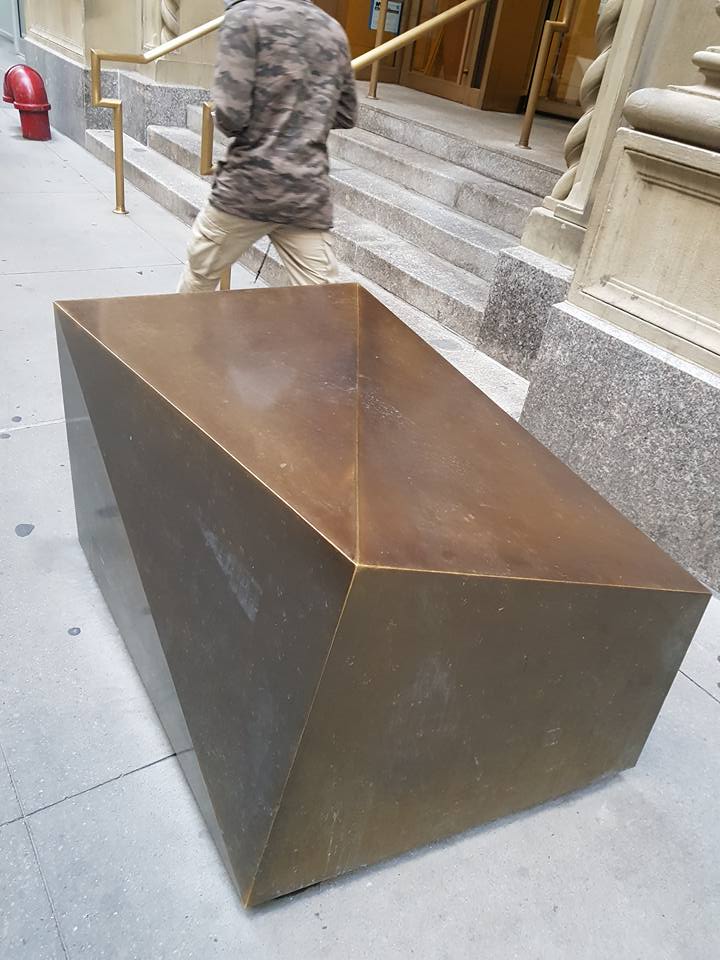 Bronze-like barricades the colour of the Charging Bull at Wall Street, perhaps for preventing terrorist vehicles from charging along walkways to plough through pedestrians. Note that they look polished, perhaps to reflect hopeful prosperity. They are slanted too, perhaps to look artsy while discouraging sitting and standing on them, which might be seen as forms of suspicious loitering. They are somewhat accidental street sculptures that symbolise the tension of hopes versus fears. Elsewhere in NY on busy streets are simply crude and squarish concrete blocks.