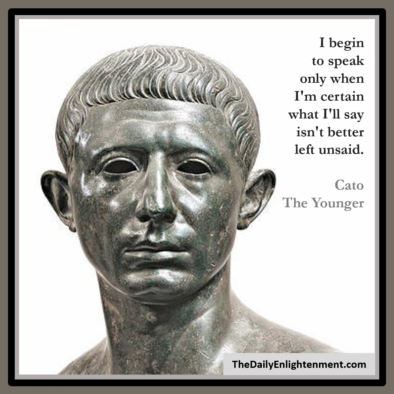When To Say Anything Karma November 9, 2021 Leave a Comment on When To Say Anything Posted in Quotes I begin to speak only when I’m certain what I’ll say isn’t better left unsaid.— Cato The Younger
