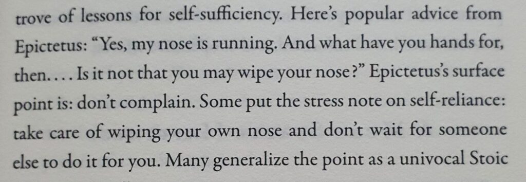 Nose Karma April 7, 2022 Leave a Comment on Nose Posted in QuotesNoseYou are independent.Don’t complain.Wipe your own nose immediately.Your nose is dependent.Don’t hesitate.Wipe it with your hand.(Pic: Stoic Wisdom, by Nancy Sherman)
