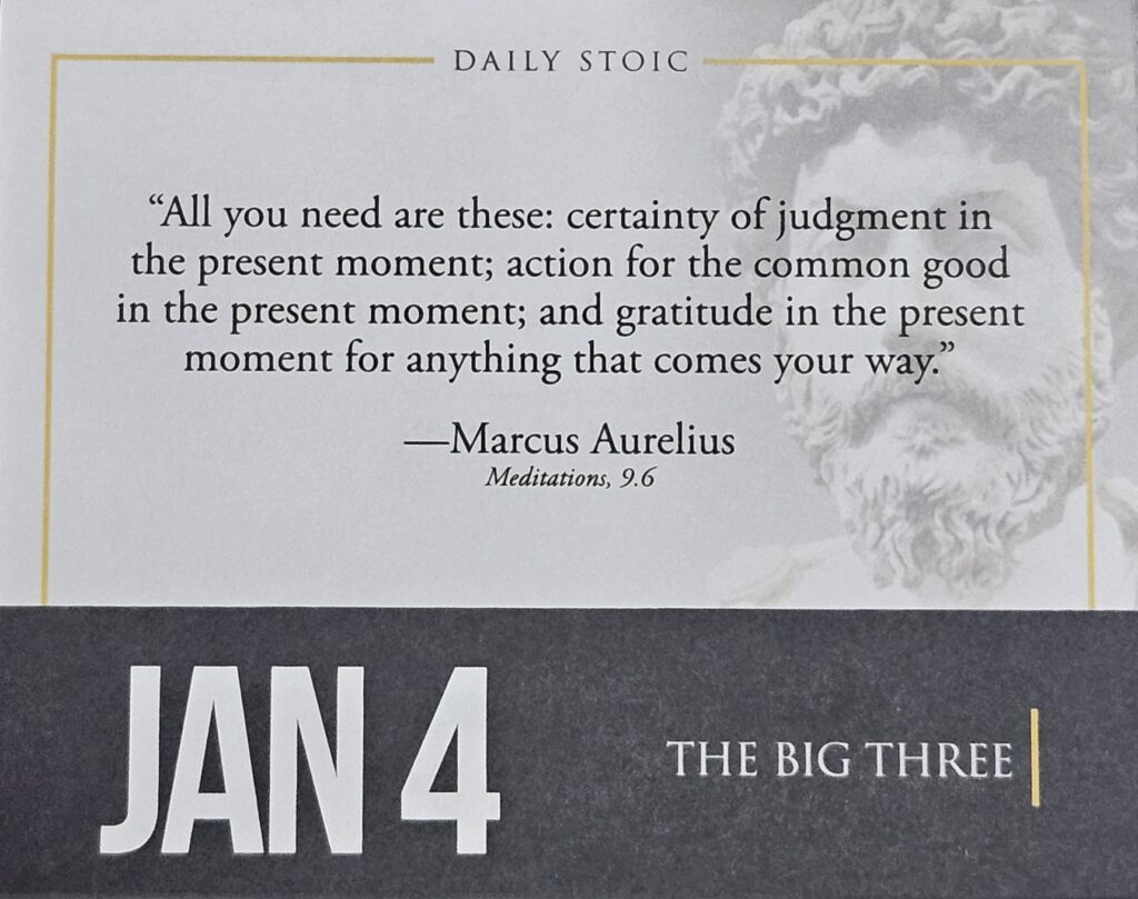 Clarity, Action And Gratitude (Jan 4) Karma March 25, 2024 Leave a Comment on Clarity, Action And Gratitude (Jan 4) Posted in Quotes _ Further Reflections 24: See clearly,and act nobly,always thankfully. 25: If you do not focus on the useful,you might be focusing on the useless.