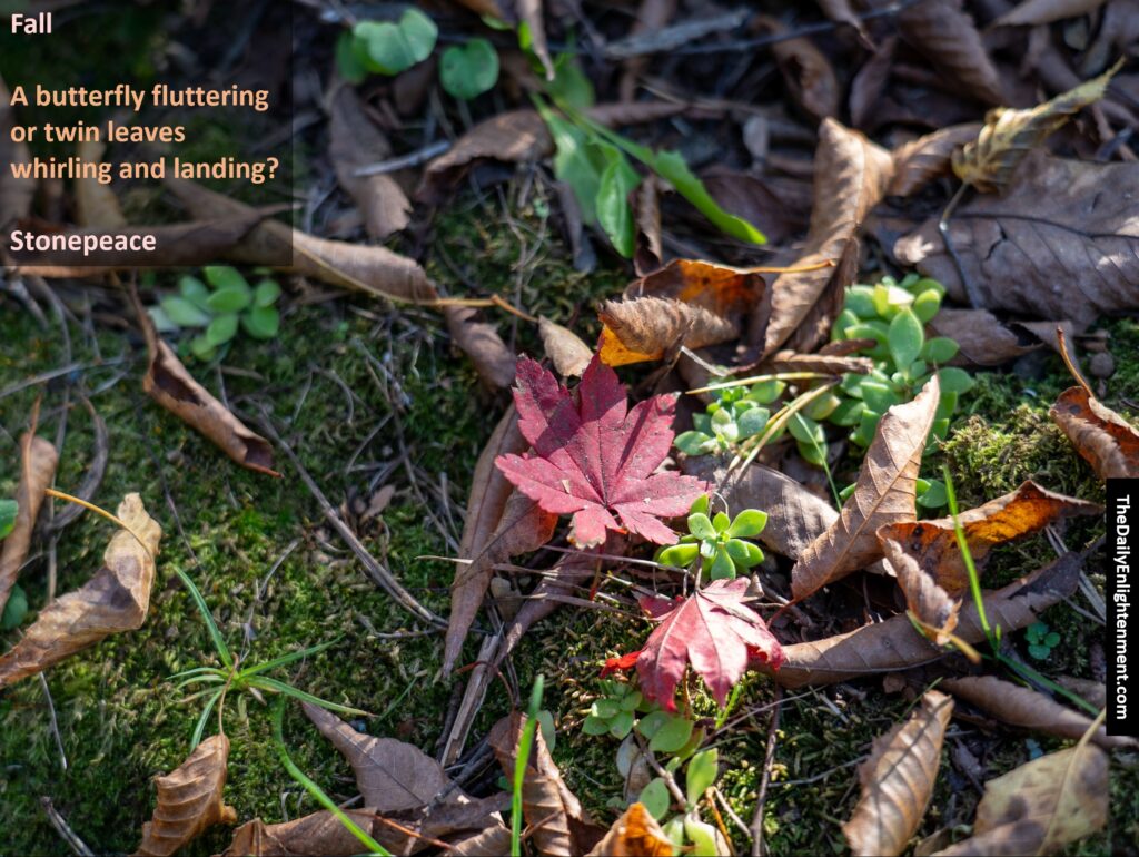 Fall (Stonepeace) moonpointer April 3, 2024 Leave a Comment on Fall (Stonepeace) Posted in Photojournal Fall A butterfly flutteringor twin leaveswhirling and landing?Stonepeace