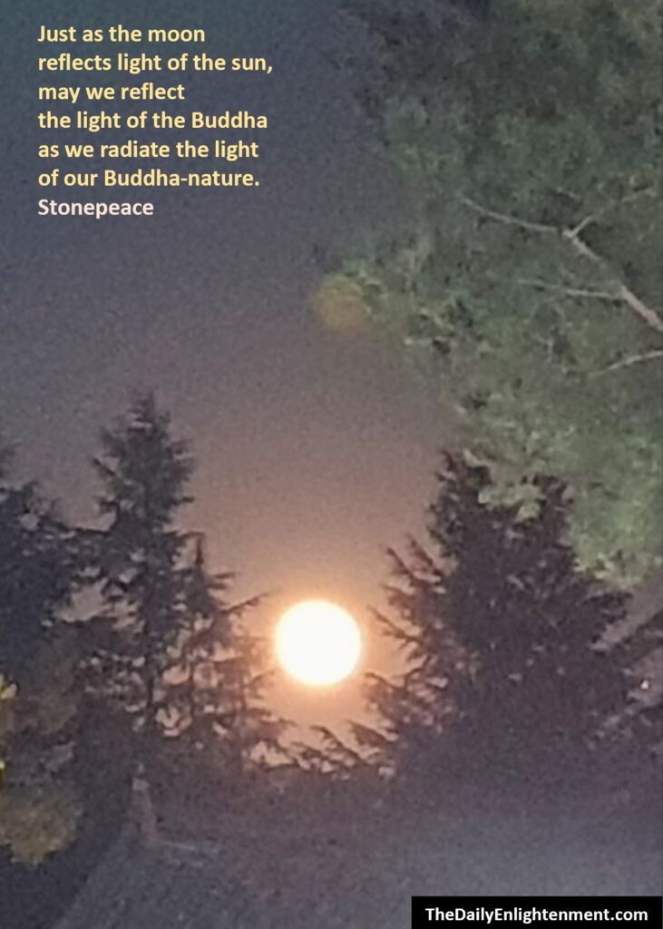 Sun, Moon & Buddha (Stonepeace) moonpointer November 5, 2024 Leave a Comment on Sun, Moon & Buddha (Stonepeace) Posted in Photojournal__Sun, Moon & BuddhaJust as the moon reflects light of the sun,may we reflect the light of the Buddhaas we radiate the light of our Buddha-nature.Stonepeace